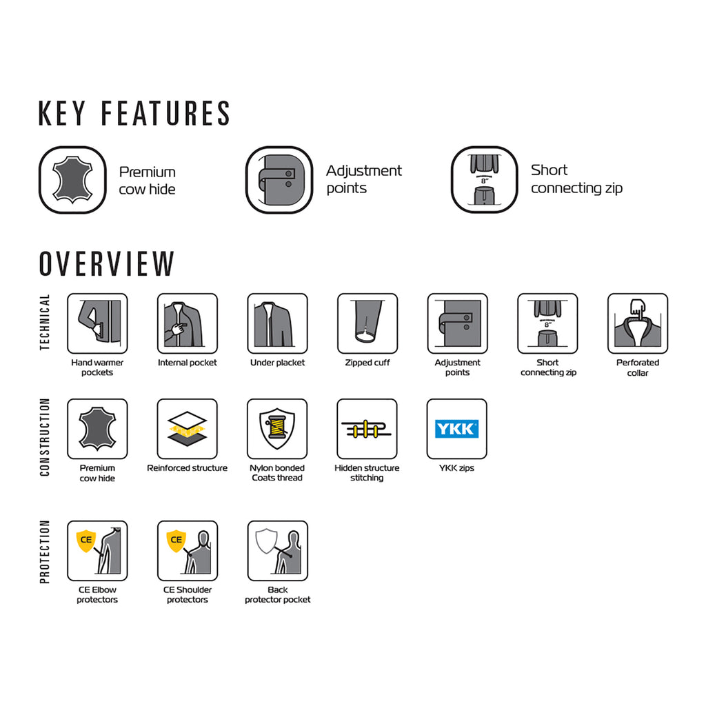 The Bladon leather jacket mixes contemporary style with a slice of café racer chic. Using cow leather, it is lightweight, supple and sporty and this hard-wearing riding jacket is complete with CE-approved shoulder and elbow armour, triple stitching to the back of the arms for added strength and 4 pockets on the front. The debossed Oxford logo finishes off a great-looking jacket.