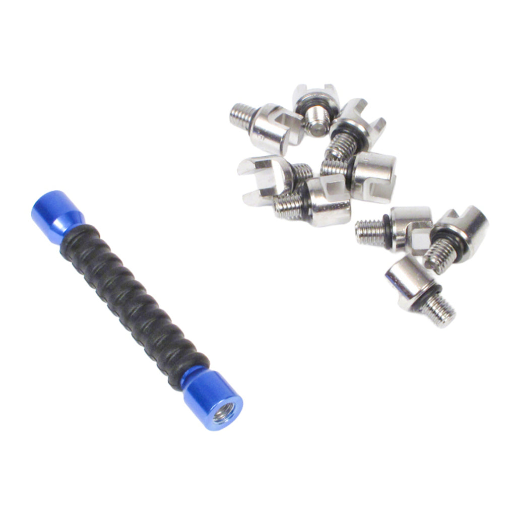 Universal Spoke Wrench with nine screw-in heads to fit a multitude of spoke sizes.